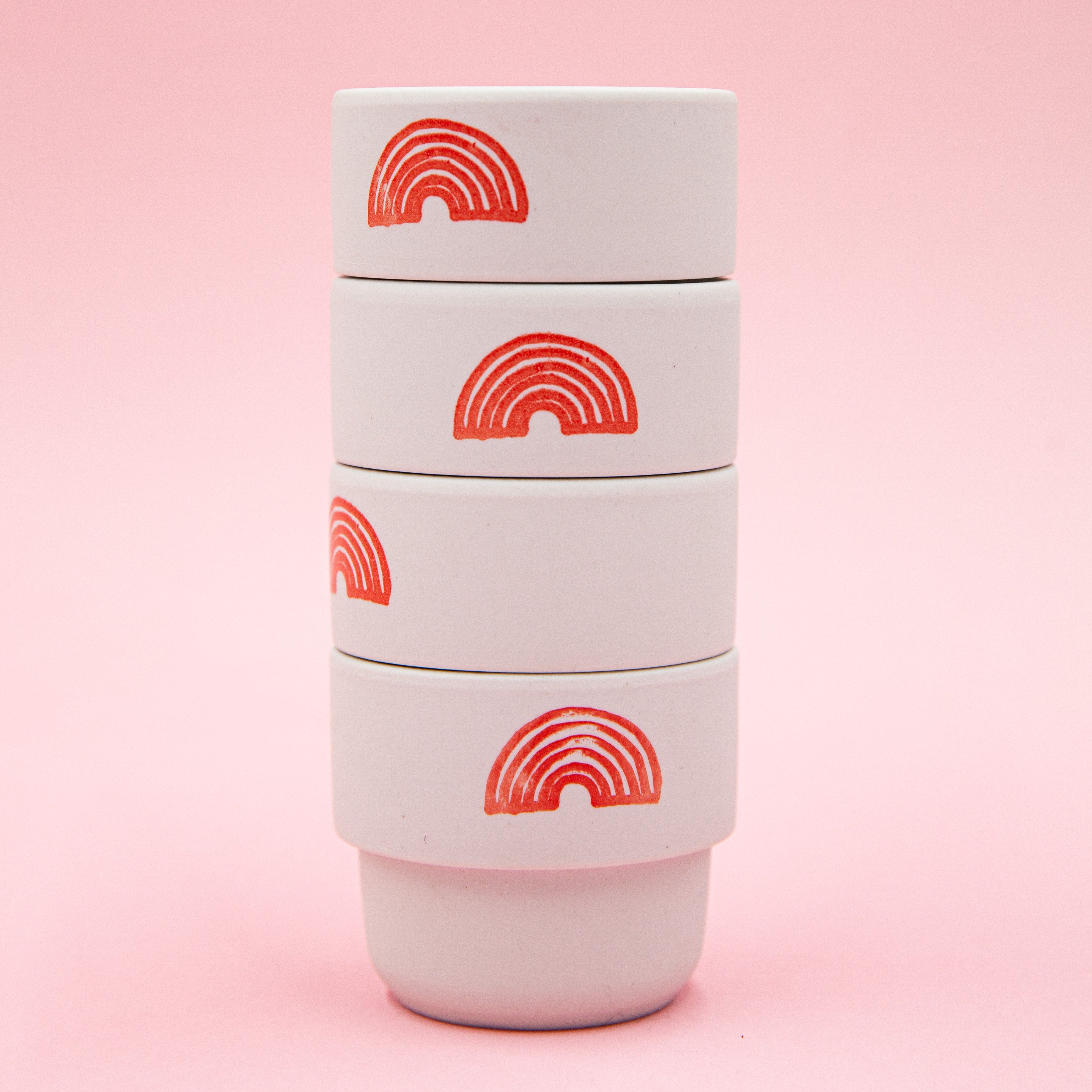 Glazed on the inside, matte on the outside. Red rainbow print.